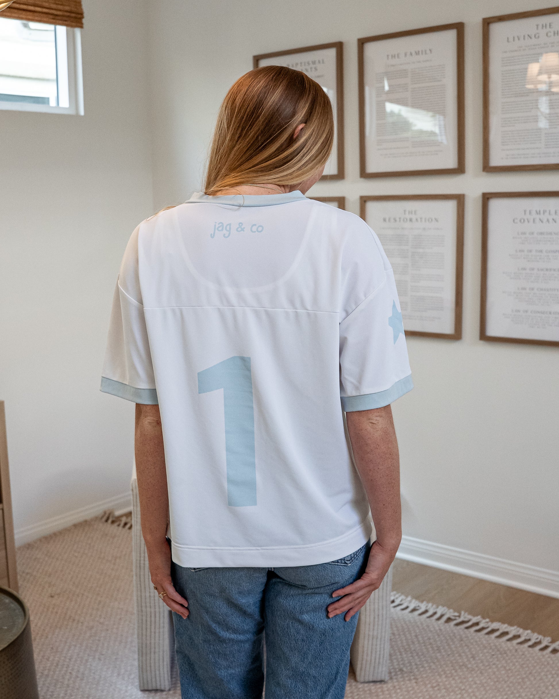 The “You’re a Star” Jersey by Jag & Co blends soft comfort with a touch of pastel magic — featuring light-blue detailing, a bold #1, and our signature star patch to remind every mom she’s the real MVP.