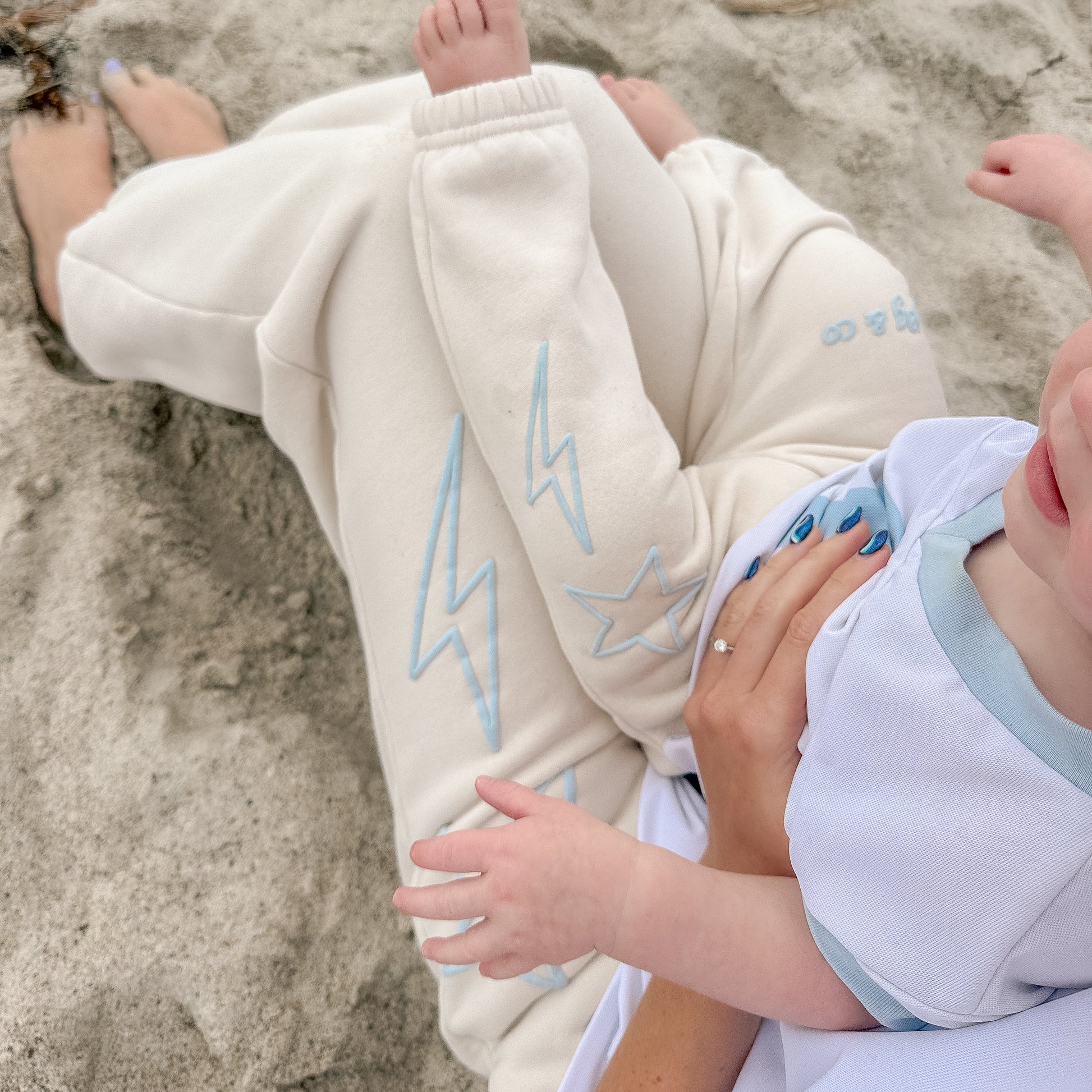- Embroidered pastel blue star + lightning details
